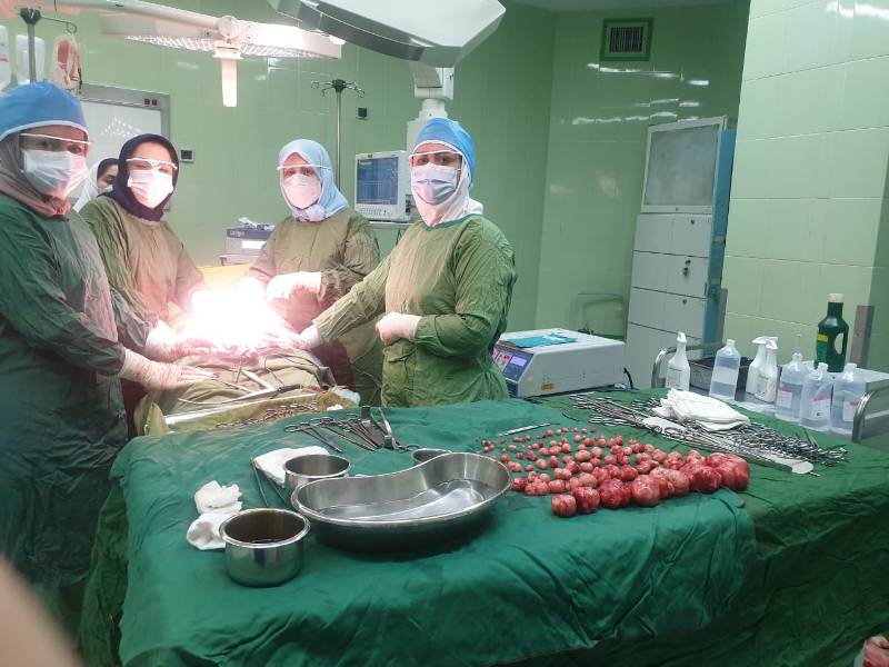 بیمار خانم 42 ساله Virgin که با شکایت درد شکم و خونریزی غیرنرمال و حجیم رحمی به درمانگاه انکولوژی بیمارستان الزهراء مراجعه کرده بود در سونوگرافی میوم های متعدد در تمامی قسمتهای رحم بصورت ساب سروز، اینترامورال و ساب موکوزال وجود داشت . آزمایشات انجام شده آنمی مزمن ناشی از خونریزی طولانی مدت رحمی را نشان می داد . بیمار تحت لاپاراتومی و میومکتومی آبدومینال قرار گرفت و حدود 97 میوم از بخشهای مختلف رحم خارج شد و رحم بازسازی و حفظ گردید و بیمار 3 روز بعد از جراحی با حال عمومی خوب از بیمارستان مرخص شد.
