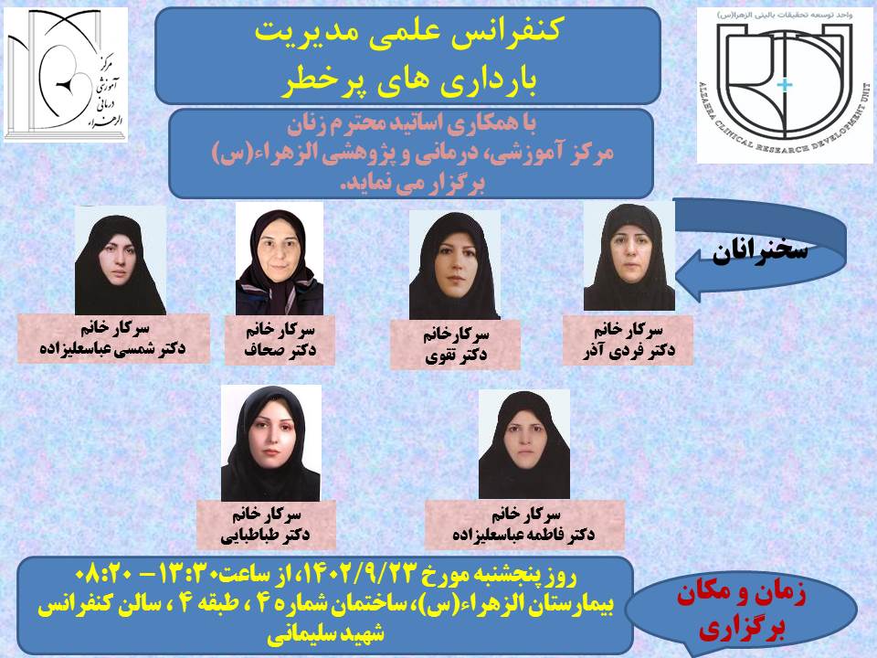گروه زنان مامایی کنفرانس علمی مدیریت بارداری های پرخطر روز پنجشنبه مورخ 1402/9/23 در سالن کنفرانس مرکز برگزار می نماید .
