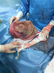 بیمار خانم 37 ساله اهل و ساکن یکی از روستاهای اطراف سراب با درد و بزرگی شکم به مرکز آموزشی و درمانی الزهراء ارجاع شده بود. در معاینه توده شکمی سفت تا حد گزینوئید قابل لمس بود. در طی جراحی که توسط خانم دکتر مریم واعظی عضو هیئت علمی گروه زنان و فلوشیپ انکولوژی زنان انجام شد تومور بزرگ solid – cystic  40-35 سانتی متری با وزن حدود 10 کیلوگرم (حاوی 7 لیتر مایع موسینی و 3 کیلو جزء solid )با منشاء از تخمدان چپ ، که حدود 5/2 دور ، دور پایه عروقی تخمدان پیچ خورده و باعث جابجائی رحم به خلف شده بود. سالپنگوافورکتومی همان سمت انجام شد و تومور بطور کامل خارج گردید طی frozen section انجام شده از borderline Muscinus tumor گزارش شد و با توجه به پاتولوژی امنتکتومی و آپاندکتومی انجام شده رحم و تخمدان مقابل حفظ گردید. بیمار دو روز بعد با حال عمومی خوب مرخص شد.